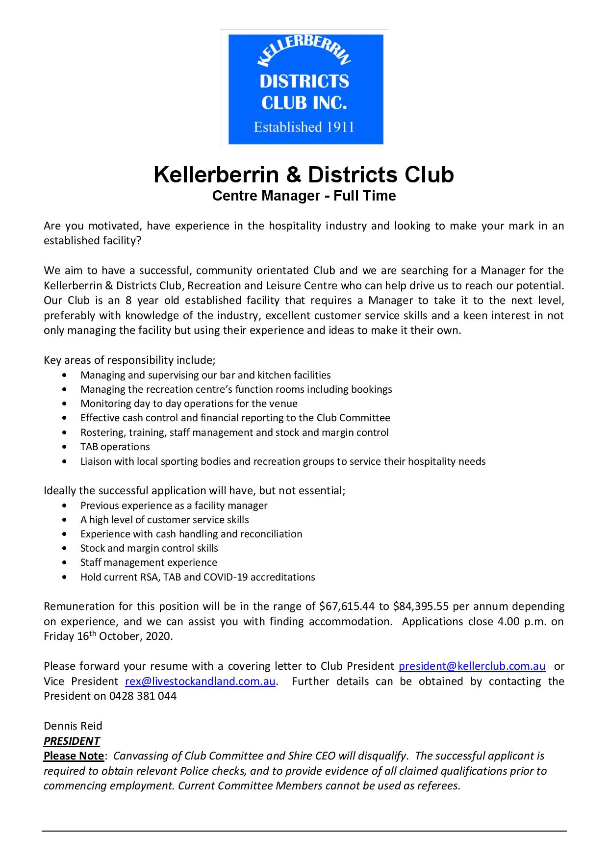 Please forward your resume with a covering letter to Club President president@kellerclub.com.au or Vice President rex@livestockandland.com.au. Further details can be obtained by contacting the President on 0428 381 044.